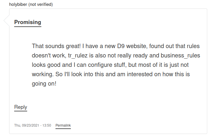 The Rules module for Drupal 8 is still in its alpha release stage … still needs significant work. (Excerpt description tr_rulez)