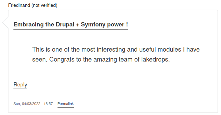 At the same time, Drupal CMI helps to track all the changes. In the future, we may even be able to support revisions and moderation, so that rock-solid workflows can be applied when needed.