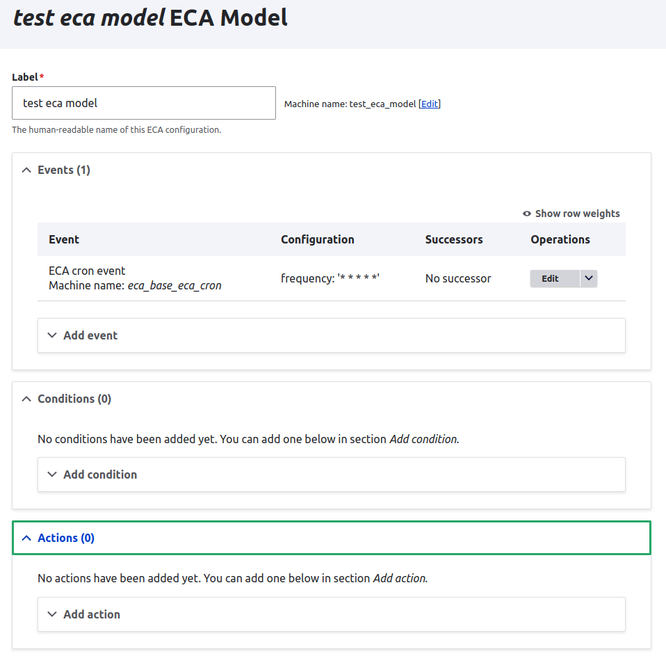 Simple low-level UI to ECA config entities, using Drupal’s form API to build event-driven action chains with optional conditions. Provided by the eca_cm module.